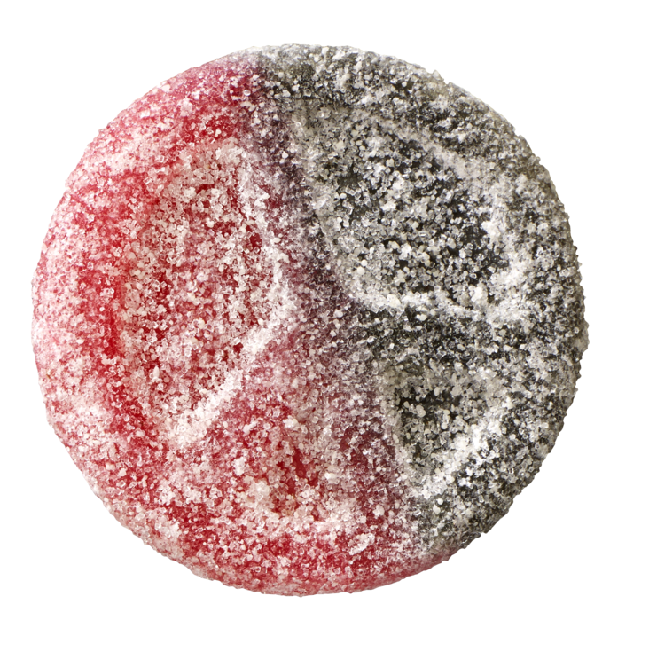 sukker, glykosesirup, gelatin, invertsukker, surhetsregulerendemidler (eplesyre, sitronsyre, natriumcitrat), vann, stabilisator (sorbitol), lakrisekstrakt, overflatebehandlingsmiddel (karnaubavoks), fargestoffer (E120, E153), og aromaer.